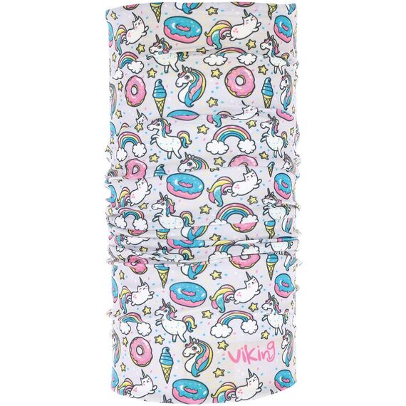 Návrh pro nejmladší milovníky zimních sportů a aktivit na čerstvém vzduchu. Přišitý fleece k bandaně umožňuje nosit ji různými způsoby a dobře chrání krk. Tento model se vyznačuje nádhernou, decentní barevnou paletou, na jemně růžovém pozadí se opakují motivy jednorožců, sladkostí a duhy.