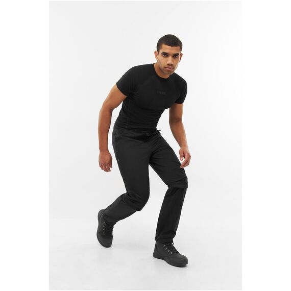 Vyrobeno z elastického softshellu se strukturou zajišťující dobrou prodyšnost a rychlé schnutí. Materiál má impregnaci omezující pronikání vlhkosti, a zároveň zůstává prodyšný, což se osvědčuje během intenzivního úsilí. Střih s anatomicky tvarovanými koleny a klínem v rozkroku zlepšuje rozsah pohybu, a zesílení na klíčových místech zvyšuje trvanlivost při častém kontaktu se zemí.