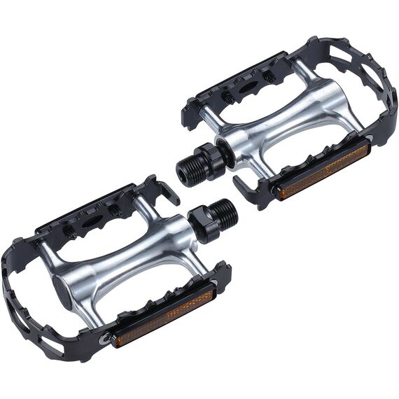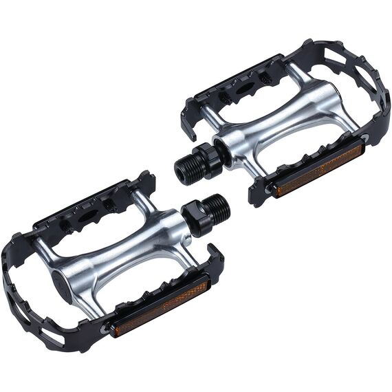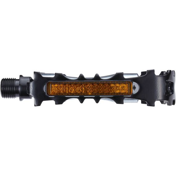 Výjimečný zoubkovaný vzorek jak z vrchu, tak zespodu pedálů zajišťuje vynikající přilnavost boty i v obtížných, mokrých podmínkách. Použitá osa z chrom-molybdenové oceli, doplněná o kuličková ložiska, zaručuje plynulý chod a vysokou odolnost proti opotřebení. Další výhodou je přítomnost oboustranných odrazek, které výrazně zvyšují bezpečnost při jízdě za tmy a ve špatné viditelnosti, zvyšující vaši viditelnost pro ostatní účastníky silničního provozu.