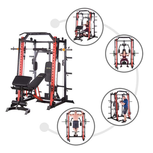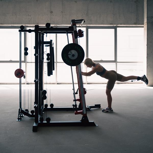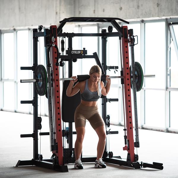 - Smithův stroj: Zajišťuje stabilní vedení tyče během různých cvičení, jako jsou dřepy nebo mrtvé tahy.