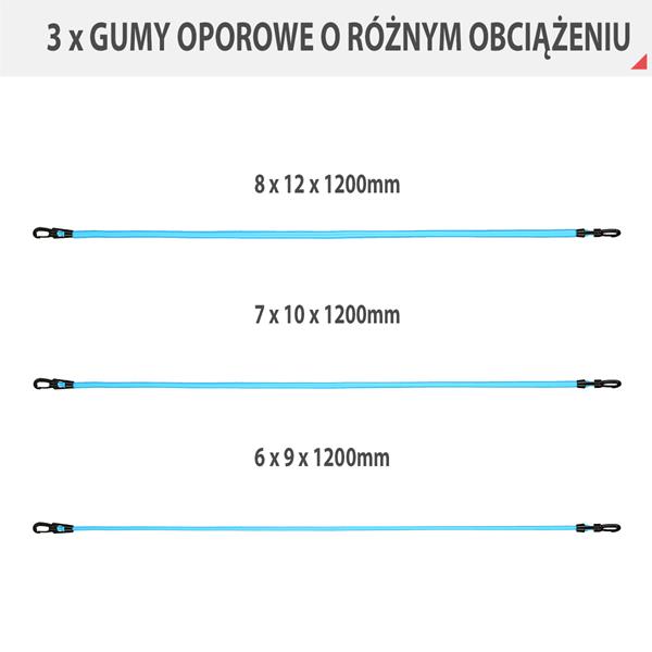 - Tři gumy s různým odporem (6x9 mm, 7x10 mm, 8x12 mm) umožňují postupné zvyšování intenzity tréninku