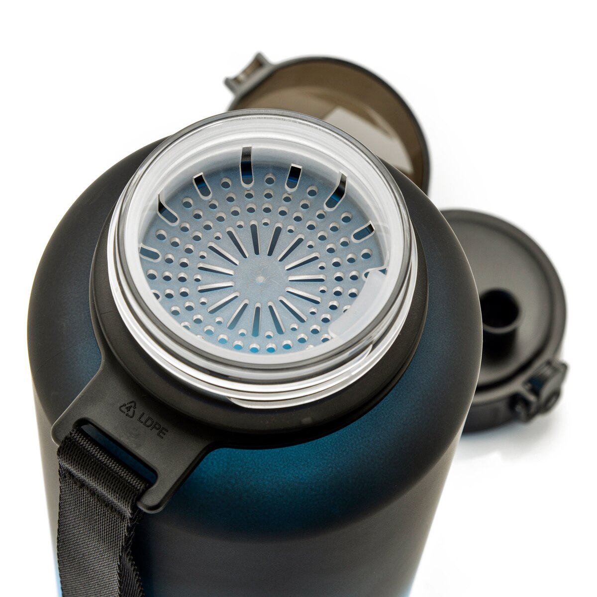 Praktická láhev, kterou si můžete vzít s sebou na trénink, do posilovny, do školy nebo na cyklistický výlet (lze pít pouze jednou rukou). Láhev je průhledná, s matným povrchem a protiskluzovým povrchem. Zajišťuje plynulý, jemný a rovnoměrný tok vody, bez mačkání láhve a sání. Je vybavena odměrkou a sítkem pro oddělení např. ovoce nebo kostek ledu. Má vhodnou velikost pro většinu držáků v automobilech a na kolech. Disponuje pohodlným nosným páskem. Je utěsněna uzávěrem s blokací, ale přitom se snadno a rychle otevírá jedním dotykem. Díky speciální blokaci víčka se nemusíte obávat náhodného vylití nápoje. Víčko navíc chrání hubici před znečištěním.