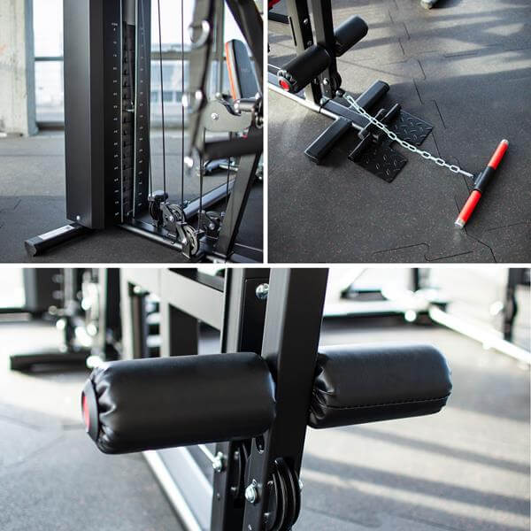 Atlas je vybaven závažím 80 kg s regulací po 5 kg, což umožňuje přesné nastavení zátěže. Tři nezávislé kladky (horní, střední, dolní) umožňují provádět různé cviky zapojující svaly zad, ramen, hrudníku a nohou.