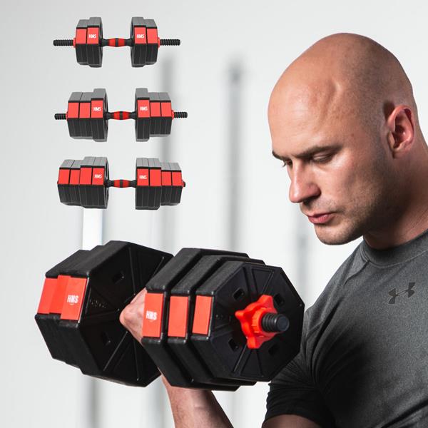 SGC40 HMS je inovativní set dvou kompozitních jednoruček s vyměnitelnou zátěží, který lze přeměnit na činku díky speciálnímu prodloužení. Je to nezbytnost každé domácí posilovny, umožňující všestranný trénink. Set spojuje vysoce kvalitní materiály, jako je PVC, cement, železo a pěna, což zajišťuje trvanlivost a dlouhověkost vybavení.