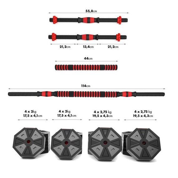 - Snadná přeměna: Díky speciálnímu prodloužení lze dva krátké hřídele spojit v jeden dlouhý, což umožňuje provádět cviky, které nejsou dostupné pouze s jednoručkami.