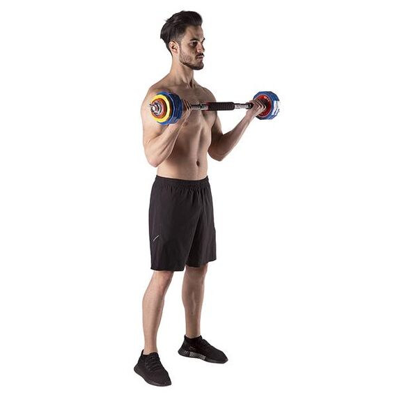 - Možnost spojení: Dvě krátké hřídele lze spojit v jednu dlouhou činku, což výrazně zvyšuje rozmanitost tréninků.