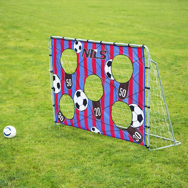 NT7788 je volně stojící fotbalová branka s panelem na trénink střelby v sadě. Ideálně se hodí pro tréninky na zahradě a na hřišti. Konstrukce je vyrobena z ocelových profilů. Branku lze upevnit k zemi pomocí osmi kotvících prvků, které jsou součástí balení. Díky nim bude branka stabilnější. Použití vysoce kvalitních materiálů zaručuje odolnost vůči všem povětrnostním podmínkám. V tomto modelu je k sadě přiložen také panel na trénink přesných střel. Po jeho umístění na branku zůstává pouze 5 vyznačených míst, přes které můžeme vstřelit gól. Navíc každé místo má přiřazený počet bodů. To umožňuje spojení tréninku se zábavou a soutěžením o získání většího počtu bodů. Panel se připevňuje na speciálních suchých zipem.