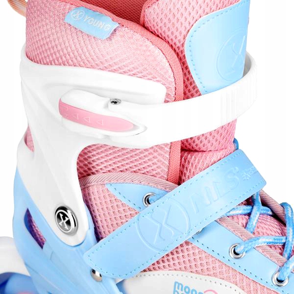 Poloměkká bota s ventilačním systémem zajišťuje komfort při delších jízdách, a prodyšná membrána snižuje pocení nohy. Tříbodové zapínání (dvoudílná spona, suchý zip a šněrování) umožňuje přesné přizpůsobení boty noze, čímž se snižuje riziko odřenin a zranění. Hliníková podvozek v kombinaci s ložisky ABEC7 zaručuje plynulou jízdu jak na hladkém asfaltu, tak na cyklostezkách. Kolečka PU 72 mm s tvrdostí 82A jsou ideální pro začátečníky, zajišťující dobrou kontrolu rychlosti. Svítící kolečka LED se aktivují během jízdy, což zvyšuje viditelnost dítěte za slabšího osvětlení.