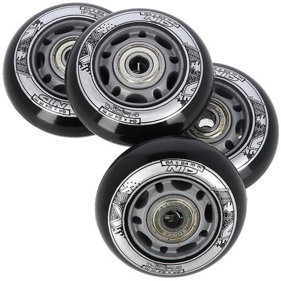 Černá PU kolečka NILS EXTREME jsou vyrobena z polyuretanu. Nejvýznamnějšími parametry koleček jsou tvrdost a průměr. Tvrdost koleček rozhoduje jak o komfortu jízdy, tak o přilnavosti k povrchu. Kolečka PU-82A zajišťují dobrou amortizaci a vynikající adaptaci na jakýkoli povrch. Průměr koleček má přímý vliv na rychlost jízdy. Kolečka s větším průměrem umožňují dosahovat vyšších rychlostí, avšak nezaručují takovou manévrovatelnost jako kolečka s menším průměrem. Ložisko ABEC 9, vyrobené z vysoce kvalitní uhlíkové oceli, které zajišťuje vynikající tvrdost a odolnost. Vyznačuje se nejnižším valivým odporem, což se promítá do nejvyšší rychlosti podle americké normy Annular Bearing Engineering Committee, zkráceně ABEC. Podstatným parametrem tohoto ložiska je excentricita, tedy kulatost na dráze vnitřního kroužku, a činí pouhých 0,0012 mm.