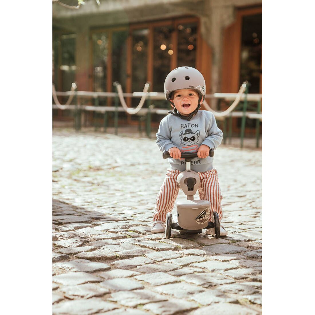 Pomocí jednoho tlačítka, bez nutnosti mít nástroje, můžete přeměnit jednostopé vozidlo na tříkolovou koloběžku. Sedadlo se stává předním rámem, stačí přesunout řídítka (připojená na klik) - a je připraveno pro starší dítě, aby začalo dobrodružství na koloběžce.