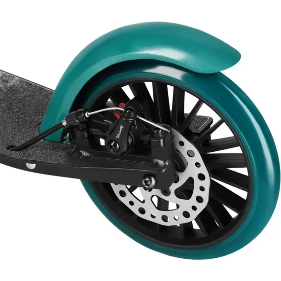 Rám vyrobený z hliníku zajišťuje odolnost vůči každodennímu zatížení při zachování nízké hmotnosti. Kolečka z PU o průměru 200 mm nabízejí dobrou přilnavost a trvanlivost na asfaltu a betonových cestách. Ložiska ABEC-9 jsou standardem v sportovních koloběžkách – zaručují přesné otáčení a minimální odpor. Přední odpružení absorbuje nárazy, což ocení uživatelé jezdící po nerovných površích. Široký podstavec (46 x 12 cm) zajišťuje stabilitu a bezpečnost během jízdy. Úchyty z měkkého TPR zajišťují pevný úchop i za vlhkých podmínek. Jednoduchý skládací mechanismus umožňuje rychle zmenšit koloběžku na rozměry 78 x 34 x 14 cm, což usnadňuje transport a skladování.