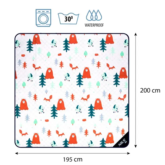 Nepromokavá deka NC8028 LAS značky NILS CAMP je nezbytnou výbavou každého milovníka trávení volného času venku. Velká plocha 195×200 cm pojme celou rodinu nebo skupinu přátel, a stylová grafika s lesním motivem dělá deku nejen funkční, ale také příjemnou na pohled.