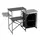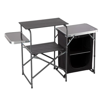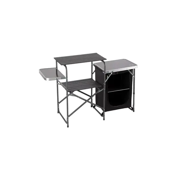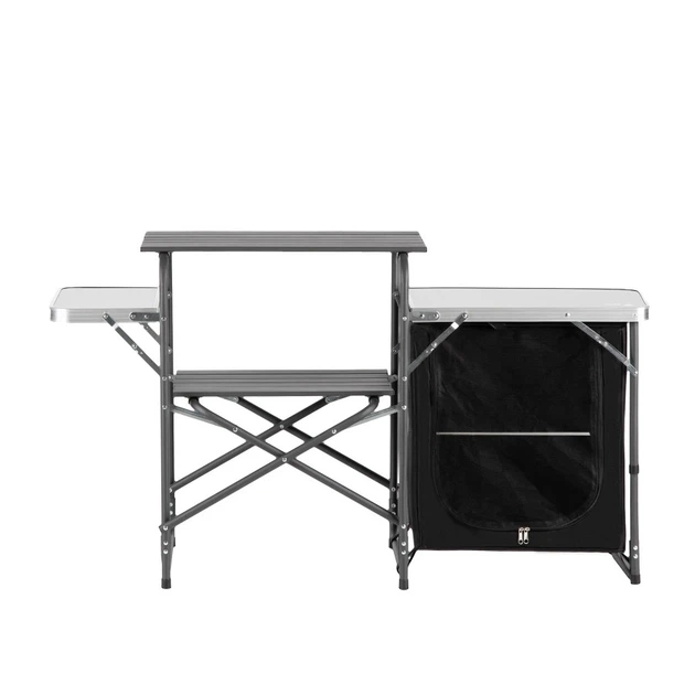Konstrukce kombinuje hliník, MDF, oxfordský materiál a ocel, což zaručuje odolnost při hmotnosti 7,5 kg. Rozměry po rozložení 140x79x48 cm s bočními stolky (celková šířka 140 cm, bez stolů 66,5 cm) umožňují efektivní organizaci turistické kuchyně. Skládá se kompaktně do tašky, ideální na kempování, festivaly nebo zahradní práce.