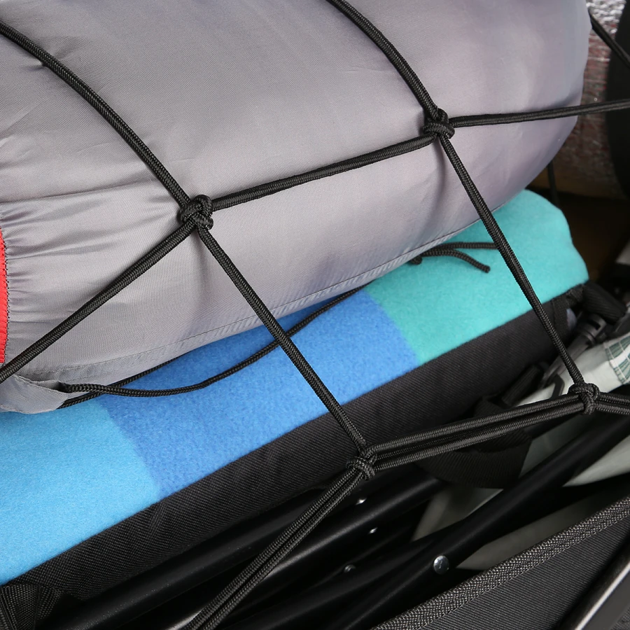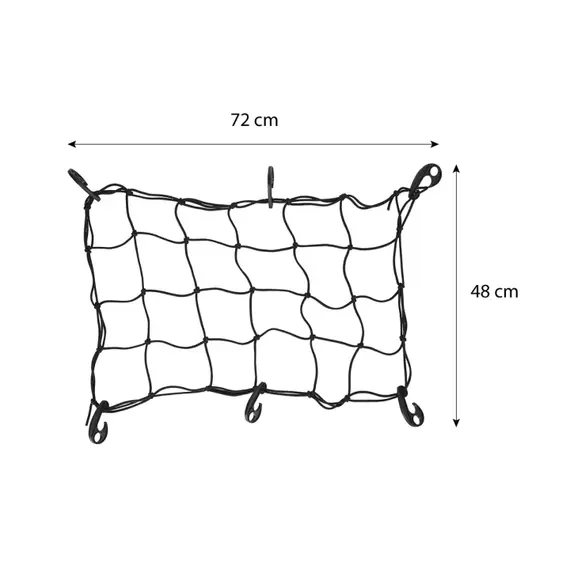 Síť vyrobená z materiálu MESH o rozměrech oka 12x12 cm zajišťuje optimální rovnováhu mezi bezpečností zavazadel a jejich viditelností. Elastická vlákna umožňují roztažení sítě na předměty různých velikostí, od malých balíčků po větší obaly. Montážní háky umožňují rychlé a spolehlivé uchycení na většině standardních cestovních vozíků a nosičů kol. Produkt se osvědčuje zejména při každodenním nakupování, cyklistických výletech a cestování, kde je nutné zabezpečit náklad před posunutím.
