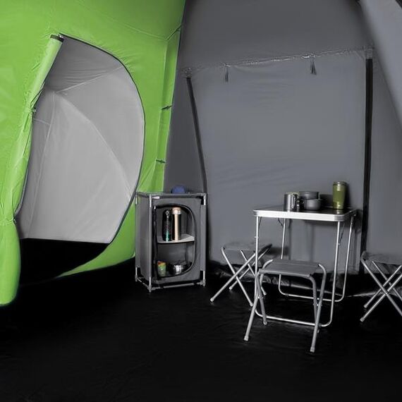 Stan Highland kromě dvou tříčlenných ložnic má také velký předsíň s podlahou o rozměrech 210cm délka x 210cm šířka x 200cm výška, díky čemuž můžete uvnitř stanu pohodlně trávit večery nebo deštivé dny a ukládat přes noc kempingové vybavení nebo batohy a boty. Další výhodou jsou dva hlavní vchody po dvou stranách předsíně, z nichž (díky speciálním rámům) lze udělat stříšku a zároveň prodloužit část předsíně.