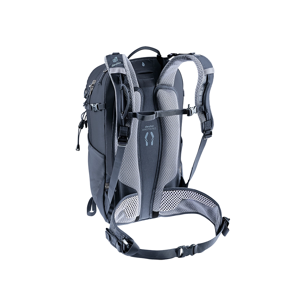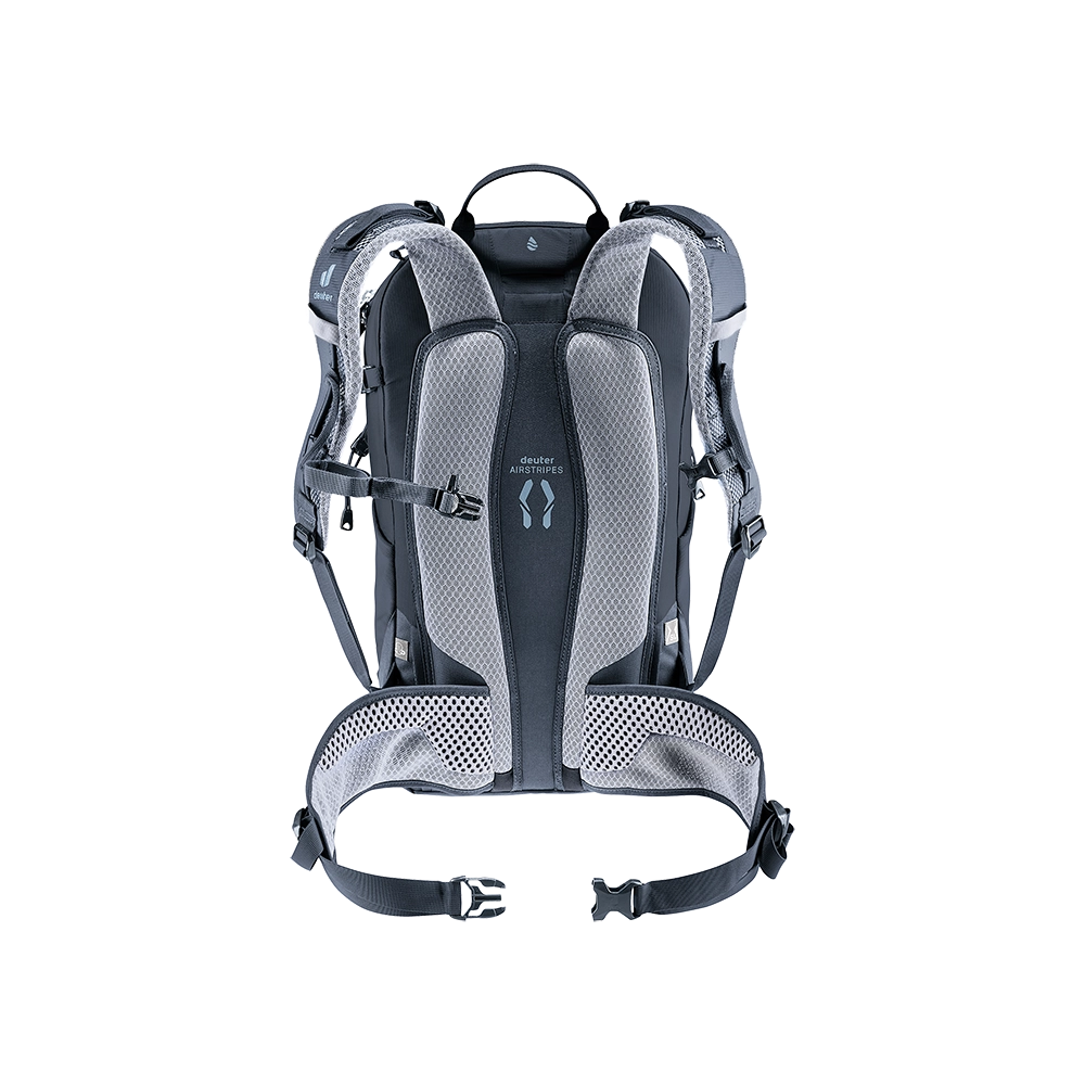 - Nosič: Deuter Airstripes - dva řady polštářků vyplněných otevřenou pěnou, pokryté síťovinou Wide AirMesh, zajišťující přilnutí k zádům a ventilaci; elastický prut Delrin udržuje batoh blíže k zádům.