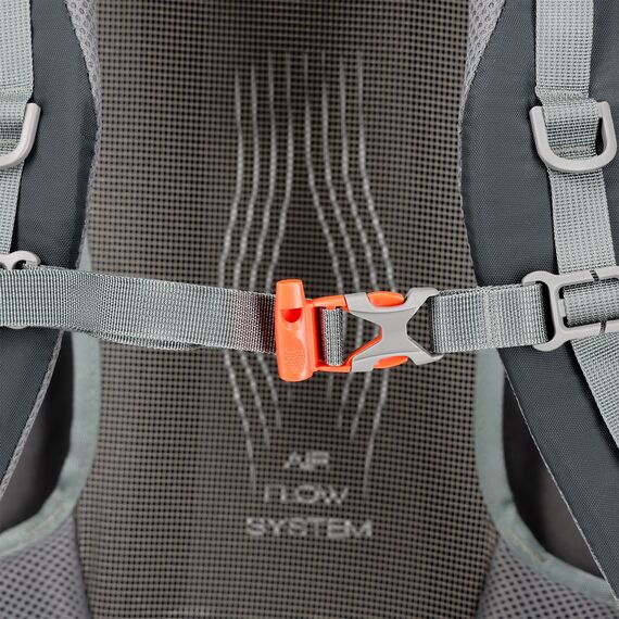 Na sponě spojující hrudní pás se nachází integrovaný záchranný píšťalka, což zvyšuje bezpečnost v nouzových situacích. Batoh také nabízí dodatečný panel úchytů pro montáž příslušenství, jako jsou trekingové hole. Dvě boční kapsy ze síťoviny a kapsy na zip na bederním pásu umožňují ukládat předměty, které chcete mít po ruce, např. telefon.