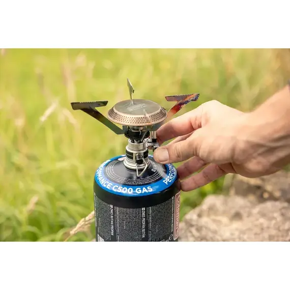 Vařič je kompatibilní s plynovými kartušemi se závitem, což zajišťuje snadnou dostupnost paliva a široké možnosti použití v terénu. Skládací ramena se zuby zaručují stabilitu i při používání větších nádob, čímž minimalizují riziko převrhnutí.